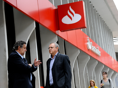 10月18日,人們在巴西里約熱內盧一家銀行外交談。