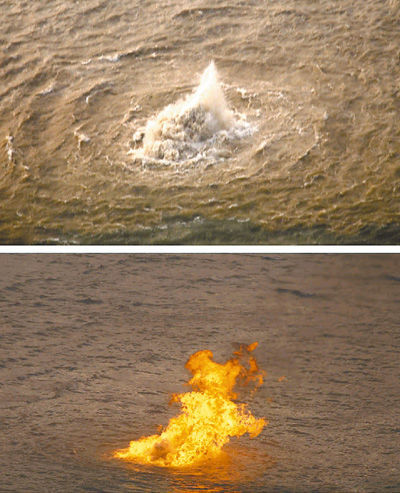 | 上圖:12月19日,泄漏的天然氣推動海水形成水柱。下圖:12月20日,為防止管線爆炸,珠海有關部門在海面泄漏點點燃天然氣。新華社發 |