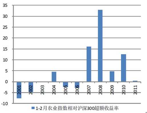 圖1:2001年至2011年1-2 月農業指數相對滬深300 超額收益率