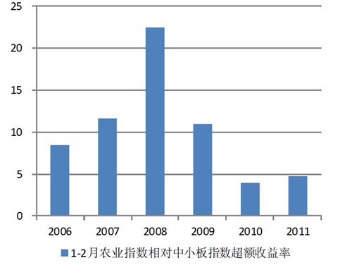 圖2:2001年至2011年1-2 月農業指數相對中小板指數超額收益率