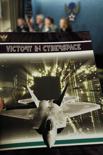 在美國首都華盛頓國家記者俱樂部舉行的一次新聞發布會上,美國空軍網絡戰爭司令部的高級官員向新聞界闡述了網絡戰爭的理念。這是在現場拍攝的美國空軍網絡戰爭司令部的宣傳冊。記者