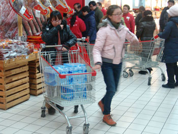 2月8日,人們在江蘇省鎮江市一家大型超市內搶購瓶裝飲用水。新華社發(楊雨/攝) |