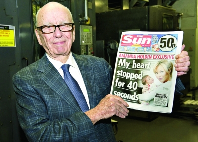 2月25日,在英國首都倫敦郊外的印刷廠,新聞集團董事長兼首席執行官魯珀特·默多克與第一版《星期日太陽報》合影。