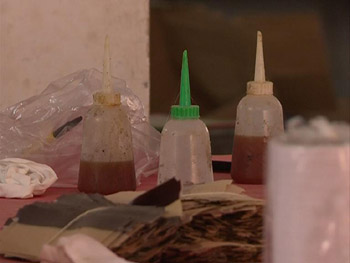 現場:黃褐色膠水散發著刺鼻氣味