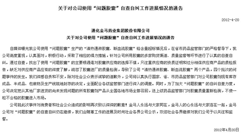 此外通化金馬藥業(yè)集團股份有限公司在其網站上公布的“關于對公司使用‘問題膠囊’自查自糾工作進展情況的通告”中使用了大量帶有褒揚性質的詞匯介紹其工作進展。“通告”中提到:“自媒體曝光我公司使用‘問題膠囊’生產的‘清熱通淋膠囊、斷血流膠囊’鉻含量超標情況后,在省市藥品監(jiān)管部門的嚴格督導下,我公司高度重視,認真面對,積極行動,采取了相應的得力措施,針對公司所用膠囊的多家購貨渠道、質量監(jiān)督等環(huán)節(jié)進行了認真的自查自糾”。