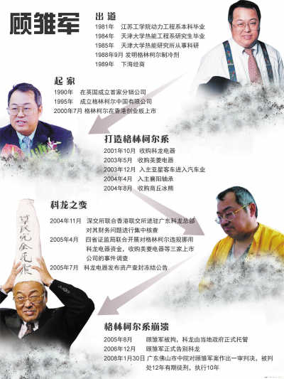 2005年5月,顧雛軍因涉嫌違反證券法規(guī)被證監(jiān)會(huì)立案調(diào)查。同年7月,其與科龍幾位高管在廣東被警方拘留。2009年,廣東省高級(jí)人民法院做出終審裁決,顧雛軍最終因虛報(bào)注冊(cè)資本罪、違規(guī)披露以及挪用資金罪被判有期徒刑10年并處罰金680萬(wàn)元。