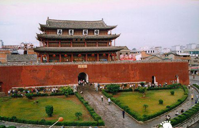 朝陽樓原名叫迎暉門,亦稱東門樓,始建于明朝洪武二十二年(1389年),比北京天安門早建28年,至今已有600多年的歷史,是祖國(guó)邊陲古老軍事重鎮(zhèn)的象征。600多年前,明軍平定云南后,設(shè)臨安衛(wèi),筑臨安城,并在四座城門上各建樓三層,東門叫迎暉門(即朝陽樓),南西北三城均毀于戰(zhàn)火,唯東門朝陽樓完好無損。朝陽樓樓層高24米,為三重檐歇山頂。檐角飛翹、畫棟雕梁、巍峨挺拔、氣勢(shì)雄偉。三樓屋檐下懸掛著“飛霞流云”、“雄鎮(zhèn)東南”的巨字匾額,是唯一幸存的清代四大榜書之一。