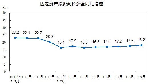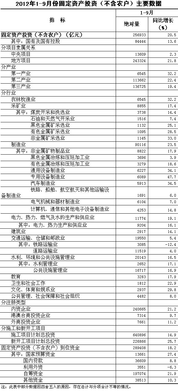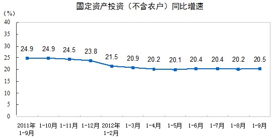 2012年1-9月份,全國固定資產投資(不含農戶)256933億元,同比名義增長20.5%(扣除價格因素實際增長18.8%),增速比1-8月份提高0.3個百分點。從環比看,9月份固定資產投資(不含農戶)增長1.63%。