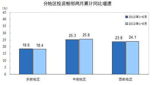分地區看,1-9月份,東部地區投資121764億元,同比增長18.4%,增速比1-8月份回落0.2個百分點;中部地區投資71470億元,增長25.8%,提高0.5個百分點;西部地區投資61715億元,增長24.1%,提高0.3個百分點。