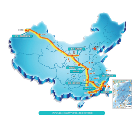 全長7378公里的西三線,設計年輸氣量達300億立方米,途經新疆、甘肅、寧夏、陜西、河南、湖北、湖南、江西、福建、廣東10個省區。西三線建成后將使我國天然氣在一次能源消費結構中的比例提高1至2個百分點。同時,還可每年減少二氧化碳排放1.3億噸、二氧化硫144萬噸、粉塵66萬噸、氮氧化物36萬噸。