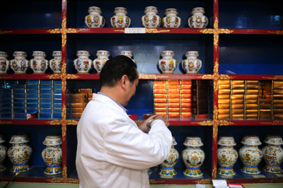 藏醫藥在甘肅省甘南藏族自治州發展已經有1000多年的歷史。近年來,在保持藏醫藥古老傳統的同時,當地充分挖掘研究藏醫藥在治療心腦血管疾病、消化系統疾病、婦科病及高原病等方面的潛力和優勢,形成科學規范系統的診斷治療標準。根據甘南藏區牧民喜歡中藏藥治療的特點,甘南及時調整了補償方案,降低了中藏藥起付線,提高了中藏藥的報銷比例,推行門診統籌。符合國家及甘肅省衛生廳下發中藏藥目錄的藥物,參合農牧民在各級定點醫療機構住院都可實行100%全額報銷,使中藏醫藥特色服務普及全州。圖為甘肅省甘南藏族自治州藏醫藥研究院附屬醫院院長虎玉成正在藥劑室內調配藏藥。