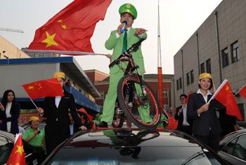 陳光標站在汽車上,舉騎自行車倡議綠色出行。當日,江蘇黃埔再生資源公司董事長陳光標在南京為他的部分微博粉絲在“反日游行”中被砸私家車進行以舊換新活動,此次用來以舊換新的43輛新車全部是國產自主的品牌。同時,陳光標表示,愿意把銷售新鮮空氣和“陳光標好人系列”有機食品的第一筆資金捐給云南、貴州災區。記者
