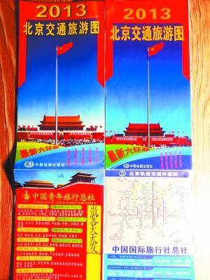記者比較兩本同樣寫著“2013北京交通旅游圖”的地圖,一份購于故宮,一份購于北京站。地圖封面同樣都以天安門為背景,兩份地圖選取的是不同的照片,但整體上十分相似。從封面上看除了印制的顏色以及照片細節(jié)不同外,其他內(nèi)容均相同,出版單位都是“中國地圖出版社”。