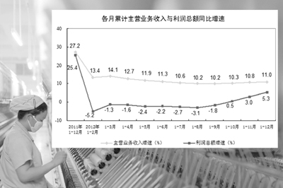 國家統計局27日發布,2012年全國規模以上工業企業實現利潤同比增長5.3%,12月當月增長17.3%。2011年12月全國規模以上工業企業實現利潤同比增長31.5%。經濟學家分析認為,從2012年9月份開始,我國規模以上工業企業利潤連續4個月正增長,說明從短期看企業經營情況在好轉。