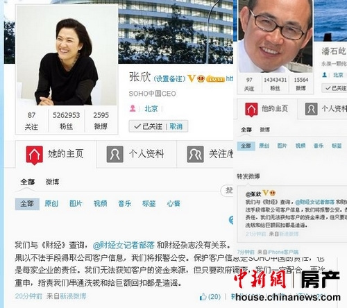 沉默了幾天的SOHO中國再次發出聲音。今天早上,SOHO中國CEO張欣在其實名微博稱,“指責我們串通洗錢和給巨額回扣都是造謠”。同時,該條微博中還提到了網友“財經女記者部落”,張欣稱經查詢“財經女記者部落”與財經雜志無關,并大力支持反腐,“但如果以不法手段取得公司客戶信息,我們將報警公安。”