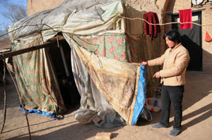 因為擔(dān)心被石油勘探放炮震裂的窯洞坍塌,鎮(zhèn)原縣平泉鎮(zhèn)姚川村村民常小萍一直住在這頂自家用塑料、破布搭的簡易帳篷里,直到大年除夕市縣領(lǐng)導(dǎo)送來一頂新帳篷。 |