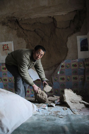 鎮(zhèn)原縣許多農(nóng)民的窯洞被石油勘探放炮震裂了,整個春節(jié)過得提心吊膽。圖為平泉鎮(zhèn)洪水村村民焦武合在收拾震塌的窯洞。(本版照片均由記者王艷明攝) |