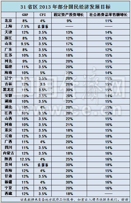 31省區(qū)現(xiàn)已全部公布了2013的地區(qū)生產(chǎn)總值增長目標(biāo)。以高低順序排序:貴州位居第一(14%),陜西第二(12.5%),并列第三(12%)的有天津、吉林、重慶、云南、內(nèi)蒙古、青海、甘肅、寧夏、西藏這9個省區(qū),并列第四(11%)的有福建、黑龍江、廣西、四川、新疆這5個省區(qū),并列第五(10%)的有江蘇、海南、安徽、湖南、湖北、江西、山西、河南這8個省區(qū),并列第六(9.5%)的有山東、遼寧這2個省區(qū),位居第七的為河北(9%)、并列第八(8%)的為浙江、北京、廣東這3個省區(qū),上海以7.5%位于最后。