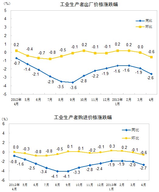 2013年4月份,全國工業生產者出廠價格同比下降2.6%,環比下降0.6%。工業生產者購進價格同比下降2.7%,環比下降0.6%。1-4月平均,工業生產者出廠價格同比下降2.0%,工業生產者購進價格同比下降2.1%。