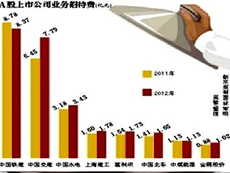 日前,證券財經(jīng)網(wǎng)站全景網(wǎng)的統(tǒng)計顯示,據(jù)2012年年報數(shù)據(jù),去年共有9家公司的業(yè)務(wù)招待費超過1億元,前十名合計達到29億元。其中絕大多數(shù)為央企,中國鐵建以8.37億元居于首位。另有241家上市公司的業(yè)務(wù)招待費超過1000萬元。
