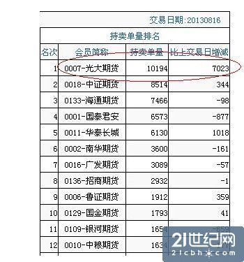據中金所下午4點28分公布的數據顯示,今日股指期貨收盤后,光大期貨方面在主力合約IF1309持有的空單量新增7023手,達到史無前例的10194手,名列所有期貨公司空單持倉排名第一。