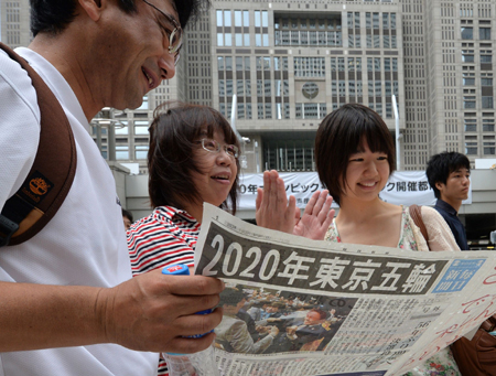8日,日本民眾在東京都政府大樓門前閱讀日本媒體為東京成功申辦2020年奧運會印刷的號外。阿根廷布宜諾斯艾利斯時間7日晚,在國際奧委會第125次全會上,經過兩輪投票和近一個半小時的等待,東京最終獲得主辦權。日本首相安倍晉三在隨后舉行的新聞發布會上表示,舉辦奧運會無疑有助于日本經濟持續增長。有報告預測,2020年東京奧運會可能幫助日本國內生產總值(GDP)增長4.2萬億日元(約423.9億美元)。