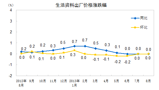 2013年8月份,全國工業生產者出廠價格同比下降1.6%,環比上漲0.1%。工業生產者購進價格同比下降1.6%,環比上漲0.1%。1-8月平均,工業生產者出廠價格同比下降2.2%,工業生產者購進價格同比下降2.3%。