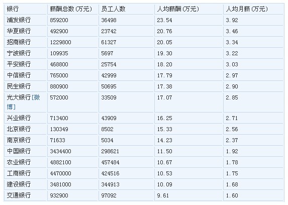 通過統計各上市銀行半年報中員工費用指標,結果顯示,國有五大銀行人均月薪排名墊底,均低于2萬元,而另外8家全國股份制商業銀行及3家城商行,人均薪酬均超過2萬元。