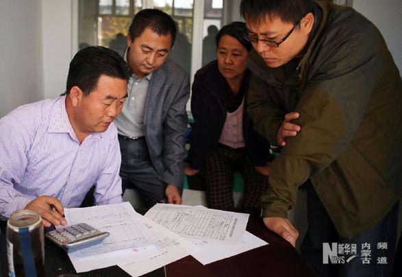 包頭市北梁棚戶區改造工程第八片區小組組長王富才(左一)幫居民核算現有住房面積,制訂選房方案。新華社記者賈立君攝