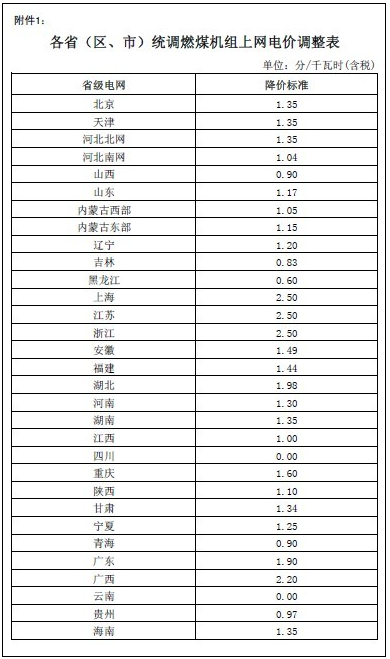 一、降低有關省(區、市)燃煤發電企業脫硫標桿上網電價,具體降價標準見附件1。各地未執行標桿電價的統調燃煤發電企業上網電價同步下調。