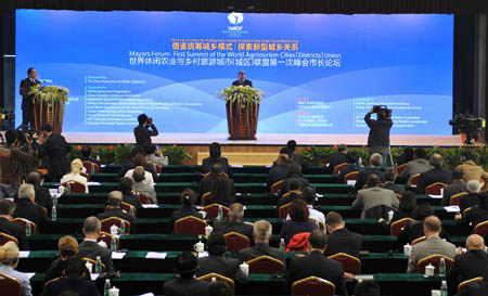 10月27日,世界休閑農業與鄉村旅游城市(城區)聯盟成立大會暨第一次峰會閉幕式在長沙望城千龍湖體育館舉行。為期3天的峰會聚集了全球五大洲46國駐華使節、26國城市市長代表,打造了一個以休閑農業為內容,以鄉村旅游為形式的跨國平臺。 圖為當日奧地利布爾根蘭州州長漢斯·尼爾斯在世界休閑農業與鄉村旅游城市(城區)聯盟第一次峰會市長論壇上演講。