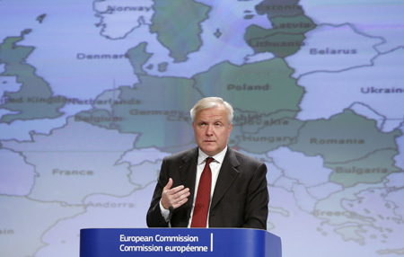 圖為歐盟委員會副主席兼經(jīng)濟(jì)與貨幣事務(wù)委員雷恩5日在布魯塞爾發(fā)布秋季經(jīng)濟(jì)預(yù)測。