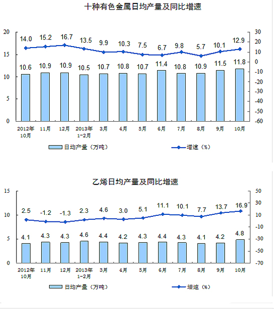 分產(chǎn)品看,10月份,464種產(chǎn)品中有328種產(chǎn)品同比增長(zhǎng)。其中,發(fā)電量4305億千瓦時(shí),同比增長(zhǎng)8.4%;鋼材9281萬(wàn)噸,增長(zhǎng)12.3%;水泥23254萬(wàn)噸,增長(zhǎng)8.9%;原油加工量4108萬(wàn)噸,增長(zhǎng)3.1%;十種有色金屬365萬(wàn)噸,增長(zhǎng)12.9%;乙烯149萬(wàn)噸,增長(zhǎng)16.9%;汽車208.5萬(wàn)輛,增長(zhǎng)25.5%;轎車115.6萬(wàn)輛,增長(zhǎng)20.0%。