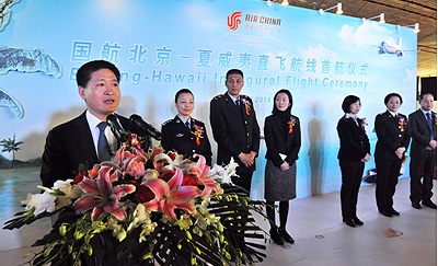 2014年1月20日15時(shí),中國國際航空股份有限公司(以下簡稱“國航”)北京-夏威夷直飛航線首航儀式在首都機(jī)場3號(hào)航站樓舉行。美國駐中國大使館、首都機(jī)場海關(guān)、北京出入境邊防檢查總站、北京出入境檢驗(yàn)檢疫局、北京首都國際機(jī)場股份有限公司及中國國際航空股份有限公司的相關(guān)領(lǐng)導(dǎo)應(yīng)邀出席首航儀式。儀式現(xiàn)場,來自夏威夷的舞者以熱情婀娜的草裙舞向來賓展示了夏威夷獨(dú)具特色的波利尼西亞文化,并為臺(tái)上嘉賓佩戴了絢麗芬芳的花環(huán),活動(dòng)現(xiàn)場洋溢著濃厚的熱帶風(fēng)情。