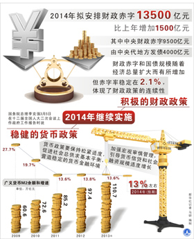 與2013年相比,收支差額的13500億元比2013年增加1500億元,而赤字率為2.1%左右,與2013年持平。“2014年實施積極的財政政策,適當擴大財政赤字,保持一定的刺激力度,同時赤字率保持不變,體現宏觀政策的穩定性和連續性,促進經濟持續健康發展和財政平穩運行。”報告稱。
