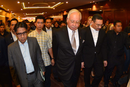 3月24日,馬來西亞總理納吉布宣布,新的數(shù)據(jù)顯示失聯(lián)的馬航MH370航班在澳大利亞城市珀斯西部的南印度洋海域墜毀。納吉布表示,根據(jù)新的分析結果,空難調查處和國際海事衛(wèi)星組織認為MH370航班曾沿著南部走廊飛行,它的“最終位置”是在珀斯西部的印度洋。 圖為納吉布(中)離開發(fā)布會現(xiàn)場。