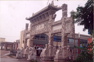 據介紹,整座牌樓用石材達110多立方米,重量超過200噸。南門牌樓略小于北門牌樓,為垂花造型。東西跨度長20米,高10米。梁托上周刻出一對飛翔的朱雀。柱體及橫梁均為剔地浮雕,奔馬、花卉形態各異,十分生動。尤其是牌樓頂端的雕塑看似蓮花而又非似蓮花,倒像是展翅欲飛的朱雀。這大概是雕塑藝術家留給欣賞者的一點懸念吧。四座牌樓還蘊涵著東青龍、西白虎、南朱雀、北玄武為四方之神的傳統意念。