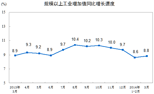 2014年3月份,規模以上工業增加值同比實際增長8.8%(以下增加值增速均為扣除價格因素的實際增長率),比1-2月份加快0.2個百分點。從環比看,3月份比上月增長0.81%。一季度,規模以上工業增加值同比增長8.7%。