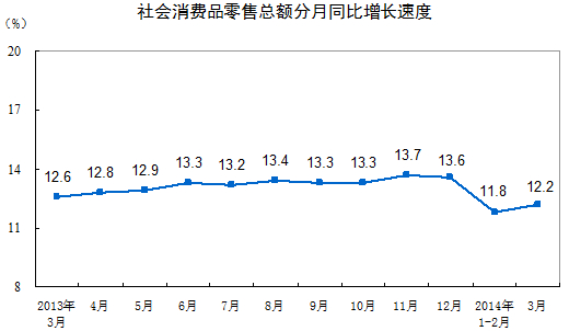 2014年3月份,社會消費品零售總額19801億元,同比名義增長12.2%(扣除價格因素實際增長10.8%,以下除特殊說明外均為名義增長)。其中,限額以上單位消費品零售額10231億元,增長10.2%。1-3月份,社會消費品零售總額62081億元,同比增長12.0%。其中,限額以上單位網上零售額[1]815億元,增長51.7%。