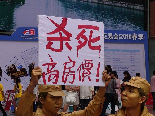 圖為2010年5月初舉行的成都房交會上,有市民裝扮得像銅人,高舉“殺死高房價”的牌子在會場內游走。而相比2010年時的房價,至今全國房價平均漲20%以上。