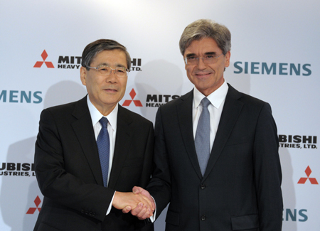 德國西門子公司16日發表聲明說,西門子將與日本三菱重工業公司聯合提交一份價值70億歐元的收購方案,競購法國阿爾斯通公司。根據該方案,西門子計劃39億歐元接手阿爾斯通燃氣渦輪機業務,包括與該業務相關的服務合同。三菱擬付31億歐元參與40%的阿爾斯通蒸汽渦輪機業務、20%的網絡技術業務和20%的水力業務,并希望以股東身份最高持有阿爾斯通10%的股份。 圖為德國西門子公司首席執行官喬·凱澤(右)與三菱重工社長宮永俊一17日在法國巴黎的記者會上握手。