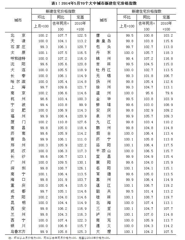 國家統計局今日公布5月70個大中城市住宅銷售價格報告。數據顯示,與上月相比,70個大中城市中,價格下降的城市有35個,持平的城市有20個,上漲的城市有15個。與去年同月相比,70個大中城市中,價格下降的城市有1個,上漲的城市有69個。