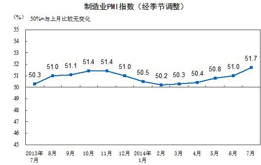 中國物流與采購聯合會、國家統計局服務業調查中心發布的2014年7月份中國制造業采購經理指數(PMI)為51.7%,比上月上升0.7個百分點。從12個分項指數來看,同上月相比,除從業人員和供應商配送時間指數回落外,其它各項指數均呈現回升。其中,生產量指數回升幅度最大,升幅為1.2個百分點;采購量和原材料庫存指數均回升1個百分點;其余新訂單、新出口訂單、購進價格以及產成品庫存指數等環比升幅均在1個百分點以內。