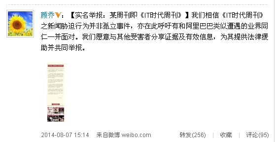 顏喬通過微博表示,“我們相信《IT時代周刊》之新聞脅迫行為并非孤立事件,亦在此呼吁有和阿里巴巴類似遭遇的業界同仁一并面對。我們愿意與其他受害者分享證據及有效信息,為其提供法律援助并共同舉報。”