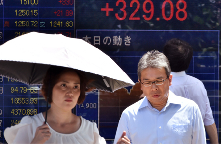 因伊拉克和烏克蘭等地緣政治緊張局勢有所緩和,加之市場認為美軍對伊拉克的軍事行動將是有限的,繼上周五紐約股市三大股指全線收高后,11日,亞太股市多數上漲。其中,日本東京股市錄得四個月以來最大單日漲幅,日經股指上漲352.15點,收于15130.52點,漲幅為2.38%。印度尼西亞、菲律賓、中國香港等多個地區股市主要股指漲幅也超過1%。 圖為行人11日走過日本東京一塊股票價格顯示屏前。