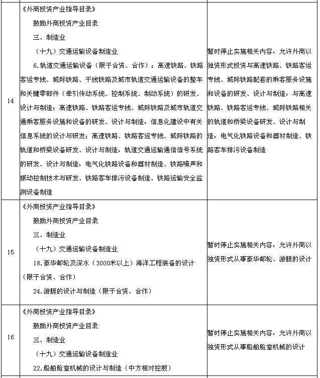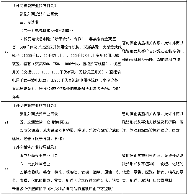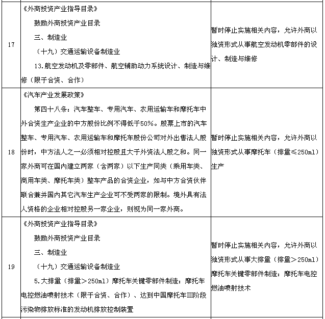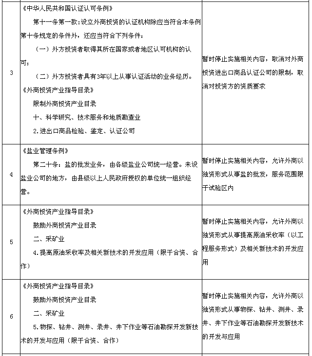 為適應在中國(上海)自由貿易試驗區進一步擴大開放的需要,國務院決定在試驗區內暫時調整實施《中華人民共和國國際海運條例》、《中華人民共和國認證認可條例》、《鹽業管理條例》以及《外商投資產業指導目錄》、《汽車產業發展政策》、《外商投資民用航空業規定》規定的有關資質要求、股比限制、經營范圍等準入特別管理措施(目錄附后)。