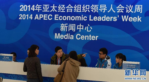 11月4日,國家會議中心新聞中心綜合服務臺的工作人員在提供咨詢服務。當日,2014年亞太經合組織(APEC)領導人會議周兩個新聞中心之一的國家會議中心新聞中心正式啟用向媒體記者開放。據介紹,新聞中心總面積約11000平方米,全面覆蓋免費無線網絡,將為媒體提供視頻、文字、圖片綜合素材和專業(yè)的廣播電視服務。新華社記者 陳曄華/攝