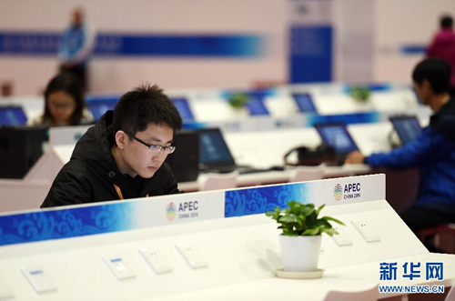 11月4日,國家會議中心新聞中心綜合服務臺的工作人員在提供咨詢服務。當日,2014年亞太經合組織(APEC)領導人會議周兩個新聞中心之一的國家會議中心新聞中心正式啟用向媒體記者開放。據介紹,新聞中心總面積約11000平方米,全面覆蓋免費無線網絡,將為媒體提供視頻、文字、圖片綜合素材和專業的廣播電視服務。新華社記者 陳曄華/攝
