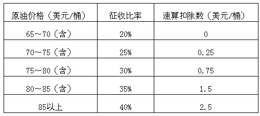 經國務院批準,財政部決定從2015年1月1日起,將石油特別收益金起征點提高至65美元/桶。起征點提高后,石油特別收益金征收仍實行5級超額累進從價定率計征。具體征收比率及速算扣除數見下表: