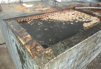在中器環保的地溝油收集池中,臟臭的地溝油被集納起來等待處置,走進這個大廳,一股濃烈的異味撲面而。周琳/攝 |